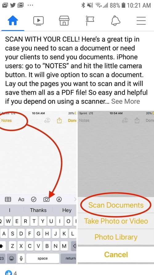 I am always trying to make it easy on my clients to get me their documents, especially when some of those documents are not available in PDF* and you don't have convenient access to a scanner or fax machine (yes those still work too!). But these days, everyone seems to have a smart phone and there are some cool applications I want to share with you that uses your phone's built-in camera. One of them is called CamScanner, another is Google Drive, and there is also iPhone Notes. All of these can turn your phone into a basic scanner. You can search your phone's App Store also for even more solutions. These tools are useful in many ways!