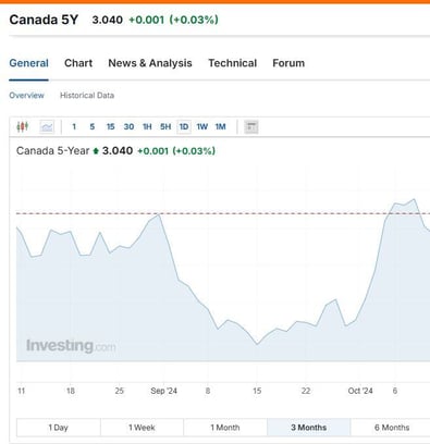 For example, the popular 5-year fixed mortgage rate will generally be about - on average - 1.6% above the 5 year Canada bond yield for a CMHC-insured purchase or renewal. If the bond yield is 3.5%, then the 5-year fixed should be ~5.1%. Click on the image if you want to see live bond market trading.